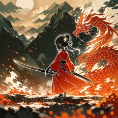 line art,chibi, (masterpiece),(best quality),chinese dragon,dragon,sword,weapon,single hair bun,holding,hair bun,black hair,holding sword,hanfu,1boy,long hair,holding weapon,male focus,red hanfu,solo,standing,long sleeves,from behind,wide sleeves,hair stick,hair ornament,fire,ink art,masterpiece,best quality,line-art