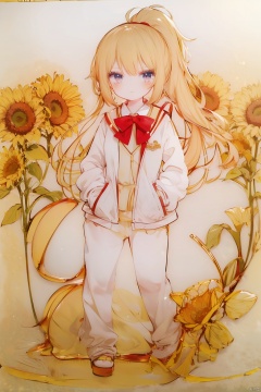 (8k, RAW photo, best quality, masterpiece:1.2),loli,petite,long hair, red Jacket,high ponytail,collared shirt,hair flower,fipped hair,floating hair,Frown,hands in pockets,dress,bowtie,(solo),sky, skyline, skyscraper, smile, solo, sunflower, tower-line art,flower-line art,,jpe-hd,ll-hd, ty-hd, pf-hd,yellow theme,simple_background