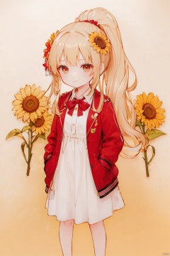 (8k, RAW photo, best quality, masterpiece:1.2),loli,petite,long hair, red Jacket,high ponytail,collared shirt,hair flower,fipped hair,floating hair,Frown,hands in pockets,dress,bowtie,(solo),sky, skyline, skyscraper, smile, solo, sunflower, tower-line art,flower-line art,,jpe-hd,ll-hd, ty-hd, pf-hd,yellow theme,simple_background