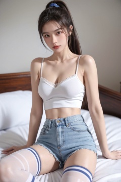 Masterpiece,highest picture quality,clear image,16K,1 girl,full body,stockings,tattered socks,brown hair,ponytail,full and straight chest,clothes not neatly dressed,revealing cleavage,tempting movements lying in bed,sexy movements,hands tied with ropes,lighting master,expression very shy,striped,thighhighs,striped thighhighs,blue thighhighs,shorts,lower body,sitting,shirt,short shorts,white shirt,underwear,skirt,panties,camisole,lying,blue shorts,denim shorts,plaid, <lora:YG诱惑坐姿01:0.85>,