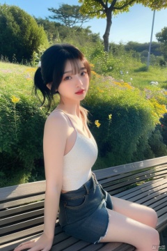 A youthful girl with a bright smile, curly brown hair tied back in a ponytail, and sparkling green eyes, sits on a worn wooden bench amidst a lush meadow, surrounded by wildflowers of every color, with the warm sunlight casting a gentle glow over her carefree pose.,zhixiaose