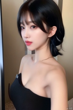 A young woman with long, luscious black hair, worn in a sleek ponytail with wispy bangs framing her face. She gazes directly into the camera lens, her parted lips painted a subtle shade of pink and her dark eyes gleaming with intensity. Her bare shoulders and upper body are illuminated by soft, natural light, accentuating her porcelain complexion.