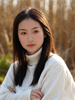 1girl, solo, looking at viewer, black hair,  long sleeves, closed mouth, upper body, black eyes, sweater, lips, plant, realistic,