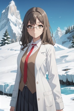 <lora:Rio-000014:0.8>,Rio CYQL,1girl,looking at viewer,solo,brown_hair,long_hair,bangs,brown_eyes,glasses,rimless_eyewear,labcoat,school_uniform,shirt,necktie,skirt,vest,laughing,bust,Glacier, Peaks, Mountains, Ice, Blue, Crevasse, Serenity, Wilderness,(Alpine flowers, Alpine peaks, Mountain meadows, Summer blooms, Alpine landscape, Mountain breeze:0.5),beautiful detailed sky,beautiful detailed glow,posing in front of a colorful and dynamic background,masterpiece,best quality,beautiful and aesthetic,contrapposto,female focus,wallpaper,