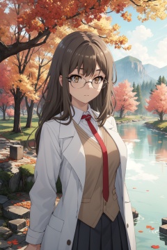 <lora:Rio-000014:0.8>,Rio CYQL,1girl,looking at viewer,solo,brown_hair,long_hair,bangs,brown_eyes,glasses,rimless_eyewear,labcoat,school_uniform,shirt,necktie,skirt,vest,moaning,full_shot,Autumn, Foliage, River, Reflection, Colors, Trees, Serenity, Beauty,(Moss-covered stones, Moss garden, Spring rain, Zen serenity, Refreshing drizzle, Japanese tranquility:0.5),beautiful detailed sky,beautiful detailed glow,posing in front of a colorful and dynamic background,masterpiece,best quality,beautiful and aesthetic,contrapposto,female focus,wallpaper,