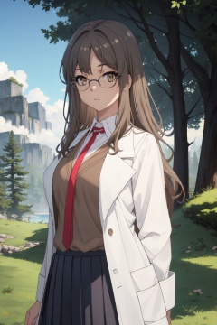 <lora:Rio-000014:0.8>,Rio CYQL,1girl,looking at viewer,solo,brown_hair,long_hair,bangs,brown_eyes,glasses,rimless_eyewear,labcoat,school_uniform,shirt,necktie,skirt,vest,teardrop,cowboy_shot,Mountains, Mist, Dawn, Sky, Peaks, Trees, Serenity, Tranquility,(Water lilies, Lotus flowers, Cattails, Willow trees, Reflections, Warm hues:0.5),beautiful detailed sky,beautiful detailed glow,posing in front of a colorful and dynamic background,masterpiece,best quality,beautiful and aesthetic,contrapposto,female focus,wallpaper,