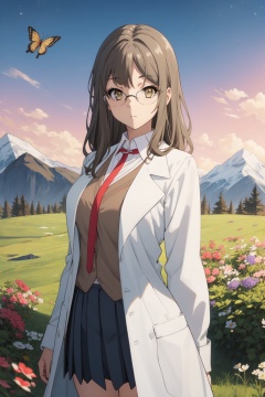 <lora:Rio-000014:0.8>,Rio CYQL,1girl,looking at viewer,solo,brown_hair,long_hair,bangs,brown_eyes,glasses,rimless_eyewear,labcoat,school_uniform,shirt,necktie,skirt,vest,smug,full_shot,Meadow, Flowers, Mountains, Grass, Bees, Colors, Serenity, Breeze,(Lavender rows, Sunset glow, Fragrant air, Golden hues, Lavender harvest, Provencal charm:0.5),beautiful detailed sky,beautiful detailed glow,posing in front of a colorful and dynamic background,masterpiece,best quality,beautiful and aesthetic,contrapposto,female focus,wallpaper,
