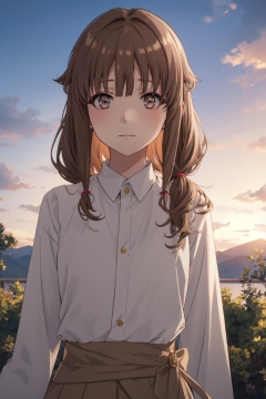 <lora:Kaede-000015:0.8>,Kaede CYQL,1girl,looking at viewer,solo,brown_hair,long_hair,bangs,brown_eyes,twintails,Linen blend button-down sundress with a cinched waist,tearing_up,upper_body,Sunset, Vineyard, Grapes, Sky, Colors, Horizon, Serenity, Harvest,(Lavender rows, Sunset glow, Fragrant air, Golden hues, Lavender harvest, Provencal charm:0.5),beautiful detailed sky,beautiful detailed glow,posing in front of a colorful and dynamic background,masterpiece,best quality,beautiful and aesthetic,contrapposto,female focus,wallpaper,