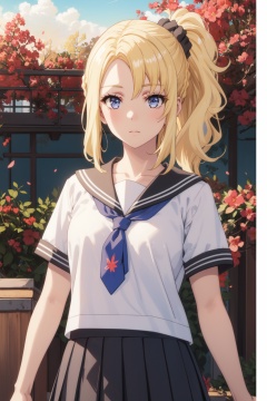 <lora:Nodoka:0.8>,Nodoka CYQL,1girl,looking at viewer,solo,blonde_hair,ponytail,bangs,long_hair,black_scrunchie,hair_ornament,hair_scrunchie,scrunchie,blue_eyes,school_uniform,skirt,serafuku,necktie,pleated_skirt,sailor_collar,shirt,short_sleeves,white_shirt,black_skirt,smirk,full_shot,Vineyard, Grapes, Harvest, Wine barrels, Autumn leaves, Sunshine, Rows, Winery,(Bamboo shoots, Bamboo grove, Lantern-lit path, Evening stroll, Zen tranquility, Bamboo shadows:0.5),beautiful detailed sky,beautiful detailed glow,posing in front of a colorful and dynamic background,masterpiece,best quality,beautiful and aesthetic,contrapposto,female focus,wallpaper,