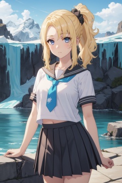 <lora:Nodoka:0.8>,Nodoka CYQL,1girl,looking at viewer,solo,blonde_hair,ponytail,bangs,long_hair,black_scrunchie,hair_ornament,hair_scrunchie,scrunchie,blue_eyes,school_uniform,skirt,serafuku,necktie,pleated_skirt,sailor_collar,shirt,short_sleeves,white_shirt,black_skirt,seductive_smile,cowboy_shot,Fjord, Glacier, Icebergs, Turquoise water, Mountains, Waterfalls, Seals, Exploration,(Rose bushes, Garden arch, Wedding ceremony, Floral arrangements, Romantic setting, Wedding vows:0.5),beautiful detailed sky,beautiful detailed glow,posing in front of a colorful and dynamic background,masterpiece,best quality,beautiful and aesthetic,contrapposto,female focus,wallpaper,