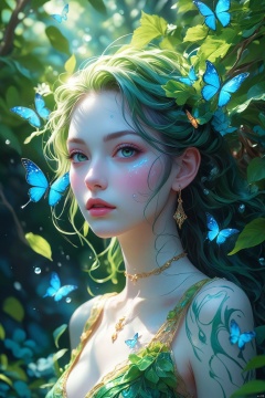 portrait of a beautiful 21yo hubggirl, seductive, shadow,long swirling green hair, lavish green leaves, falling blue flowers, celestial lighting, butterflies, tree branches, sky, golden glowing, water drops,best quality, masterpiece, high res, absurd res,perfect lighting, vibrant colors, intricate details,high detailed skin, pale skin,