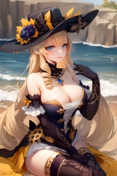 navialp,navia_(genshin_impact),1girl,solo,game cg,red lips,blonde hair,breasts,blue eyes,hat,long hair,dress,thighhighs,upper_body,portrait,gloves,bangs,bare shoulders,cowboy shot,cleavage,drill hair,black headwear,detached sleeves,hat flower,black gloves,fingerless gloves,elbow gloves,black thighhighs,strapless,smile,by the sea,sitting,crossed legs,navialp, <lora:navia6:0.8>