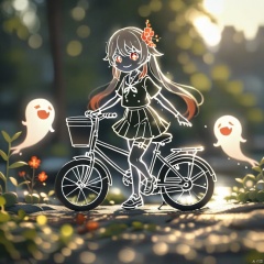 lineart,chibi, (masterpiece,best quality),1girl, hu tao \(genshin impact\), ground vehicle, twintails, red eyes, bicycle, brown hair, hair ornament, skirt, looking at viewer, symbol-shaped pupils, long hair, solo, hair flower, flower, boo tao \(genshin impact\), smile, school uniform, outdoors, ghost, boat, shirt, bag, short sleeves, holding, watercraft, shoes, plaid, alternate costume, thigh strap