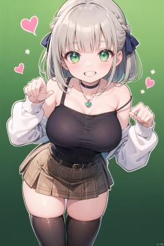 masterpiece,1girl, :d, belt buckle, black choker, black **** top, blue ribbon, blunt bangs, blush, braid, breasts, brown skirt, buckle, choker, choppy bangs, collarbone, dot nose, fanged bangs, french braid, gradient background, green background, green eyes, grey hair, grid, grin, hair ribbon, half updo, heart, high-waist skirt, looking at viewer, miniskirt, off shoulder, open mouth, outline, parted hair, paw pose, plaid, plaid skirt, ribbed sweater, ribbon, skirt, smile, snowflake pendant, solo, sweater, **** top, teeth, thighs, white outline, white sweater, sparkle,zettai ryouiki