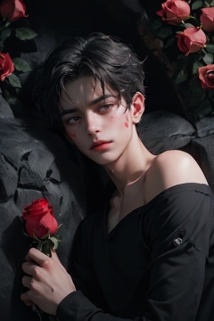 (1 boy:1.8),flower, (photography: 1.6), (masterpiece 1.2), (32k: 1.8), (many roses:1.8), looking at viewer, makeup, red lips, long hair, red flower, petals, (red rose: 1.0), brown Eyes, lips, collarbone, lipstick, there is a red spot on the face, (covered by roses: 1.2), lying on the ground, upper body,(wear black shirt:1.2),Cinematic quality,(There are red spots on the face, covered by roses:1.8),dim light,(melancholy style:1.8),(deep and dark environment:2) <lora:玫瑰少年_1.0:0.7>