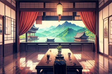 indoors, east asian, 16K CG, 8k, masterpiece, CG, best quality, high detailed, high detailed CG, No logo, no test, no humans, indoors, east asian architecture, big room, curtains, short table, scenery, ancient, ancient architecture, open Landscape, mountain, 动漫