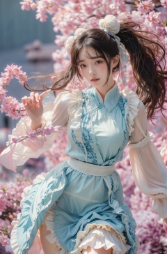 Surrealism Dream Style,glowing neon color,RAW photo,at night,1girl,solo,sea,black hair,ponytail,looking at viewer,long hair,up,lips,sash,water splaashing,hair ornament,realistic,wide sleeves,hanfu,long dress,Semi transparent gauze skirt,surrealist,Best quality,masterpiece,ultra high res,Petal skirt,wind,flowers,bloom,Clouds,smoke,neon lights, 80sDBA style, 1 girl, , , wangyushan