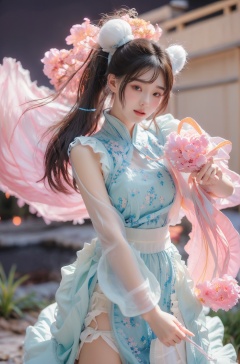 Surrealism Dream Style,glowing neon color,RAW photo,at night,1girl,solo,sea,black hair,ponytail,looking at viewer,long hair,up,lips,sash,water splaashing,hair ornament,realistic,wide sleeves,hanfu,long dress,Semi transparent gauze skirt,surrealist,Best quality,masterpiece,ultra high res,Petal skirt,wind,flowers,bloom,Clouds,smoke,neon lights, 80sDBA style, 1 girl, , , wangyushan