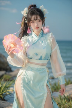 Surrealism Dream Style,glowing neon color,RAW photo,at night,1girl,solo,sea,black hair,ponytail,looking at viewer,long hair,up,lips,sash,water splaashing,hair ornament,realistic,wide sleeves,hanfu,long dress,Semi transparent gauze skirt,surrealist,Best quality,masterpiece,ultra high res,Petal skirt,wind,flowers,bloom,Clouds,smoke,neon lights,1 girl,