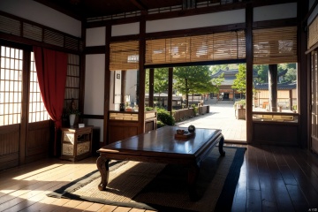 indoors, ancient, east asian, 16K CG, 8k, masterpiece, CG, best quality, high detailed, high detailed CG, No logo, no test, no humans, indoors, east asian architecture, big room, curtains, short table, books, plants, scenery, ancient architecture, window, trees, Ancient costume, wood floor,