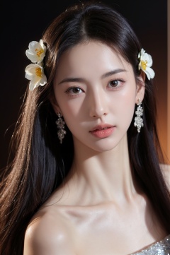 1girl, solo,(front view:1.2),(looking_at_viewer:1.4),(eye-contact:1.4),,black hair, long hair, jewelry, realistic, earrings, hair ornament, black eyes, lips, collarbone, parted lips, flower, watermark, upper body, portrait, hair flower, dress, web address, <lora:YG红颜阁美女2:0.75>,