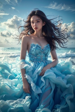 1girl,solo,dress,long hair,strapless dress,strapless,cloud,sky,breasts,bare shoulders,blue dress,realistic,outdoors,day,wind,black hair,cleavage,collarbone,lips,blue sky,jewelry,cloudy sky,ocean,medium breasts,blue eyes,sunlight,watermark,brown hair,parted lips,looking to the side,looking away,floating hair,bare arms,nose,looking at viewer,
