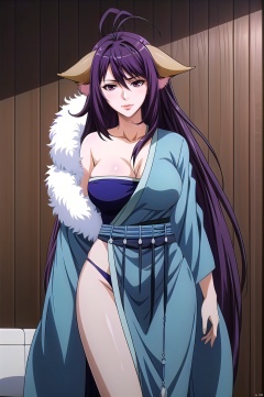 Yaya, 1girl, solo, animal ears, breasts, long hair, antenna hair, cleavage, large breasts, japanese clothes, purple hair, kimono, very long hair, brown eyes,