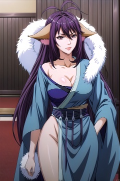 Yaya, 1girl, solo, animal ears, breasts, long hair, antenna hair, cleavage, large breasts, japanese clothes, purple hair, kimono, very long hair, brown eyes,upper_body,