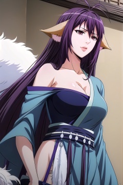 Yaya, 1girl, solo, animal ears, breasts, long hair, antenna hair, cleavage, large breasts, japanese clothes, purple hair, kimono, very long hair, brown eyes,(upper_body:1.5),