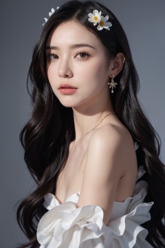 1girl, solo,(front view:1.2),(looking_at_viewer:1.4),(eye-contact:1.4),,black hair, long hair, jewelry, realistic, earrings, hair ornament, black eyes, lips, collarbone, parted lips, flower, watermark, upper body, portrait, hair flower, dress, web address, , c