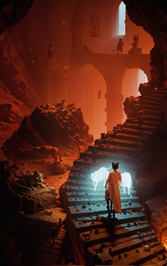 score_9, score_8_up, score_7_up, score_6_up, 8k, best quality, masterpiece, (ultra-detailed:1.1), [<lora:EndlessSteps-pony-Tanger-000017:0.5>::0.75], Endless Steps, Climbing stairs, CG, stairs, 1girl, tail, scenery, spirit, solo, from behind, black hair, ghost, cat, standing, a painting of a man walking down some stairs, a dark hallway leads up to a ladder,
