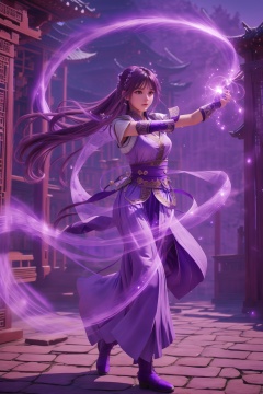 purple-aura,using purple-magic,purple-magic,ancient-costume,dancing,fighting stance,1girl,solo,long hair,brown hair,<lora:magic_fighting_purple_512_15:0.8>,