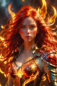 (Flame, blazing flames: 1), (body burning flames: 1.2), (magical flames: 1.2), (numerous flames floating around the girl), (best quality), (masterpiece), (super detail), super detail CG, (illustration), (light of detail), (an extremely exquisite and beautiful), girl, solo, (upper body,), (cute face), expressionless, (beautiful detail eyes), full breasts, (midchest: 1.2) red feathers, (vertical pupils: 1.2) red hair, shiny hair, five colors and six colors of hair, [Armored Woman] Armor decoration emits red flames, [suspended flames], emitting flames to decorate hair, depth of field, (firelight), whole body,