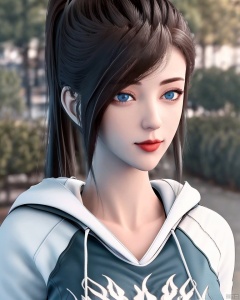 1girl, solo, long hair, blue eyes, brown hair, black hair, closed mouth, upper body, ponytail, outdoors, day, hood, blurry, lips, hoodie, blurry background, hood down, realistic, bench, white hoodie
