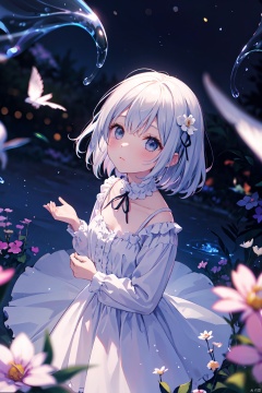 (blurry, depth of field, blurry foreground:1.35), Dreamweaver diva, phantasmal, surreal, night-sky hair, dreamscape, orchestrating, symphony of slumber, dress of dusk, floating among dreams, deep night, lullaby of the subconscious, dream orchestration scene, Neck, Unity, (from above), flower, 1girl, backlight, colors