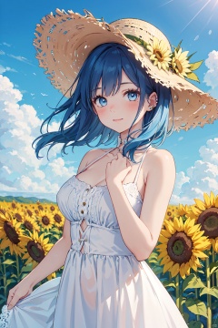 A breathtaking masterpiece! A stunning young woman with striking blue hair and piercing blue eyes poses in a picturesque field of sunflowers, her sleeveless white dress fluttering gently in the breeze. She wears a straw hat adorned with a yellow flower, her bangs framing her radiant smile as she gazes directly at the viewer. Her bare shoulders and medium breasts are subtly showcased, while her hand rests on the brim of her hat. The bright blue sky above is dotted with fluffy clouds, creating a soft focus effect that blurs the edges. As she looks up at the heavens, a gentle blush rises to her cheeks.
