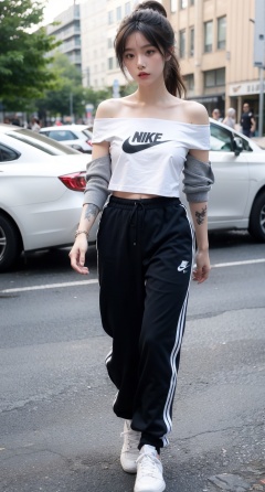 14 years old girl,The golden ratio body,asian,White off-the-shoulder T-shirt,medium breasts,tattoo,city,perspective,high ponytail,1girl,xxs, Straighten your legs,Steps,hand remove shirt, Add details,full body photo ,outdoor,tattoos blackwork,moyou,walking, pink sneakers ,Hyperrealism,track pants,Nike,solo