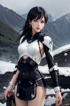 (High quality, High resolution, High quality, Fine details), 1girl, black hair, long hair, mountain background, short dress, black hair, earrings, ,Laegrinna,bodysuit