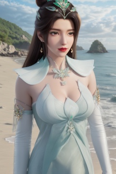 photo_\(medium\),(8k, RAW photo, best_quality),(masterpiece:1.2),(realistic:1.2),(photorealistic:1.3),(ultra-detailed),(extremely_detailed_cg_8k_wallpaper),(crystal_texture_skin:1.3),(shiny:1.2),(shiny_skin:1.4),(extremely_delicate_and_beautiful),shenfengYanRuYu,1girl,solo,detached sleeves,green dress,torogao,bouncing breasts,hair bun,standing,jewelry,hair ornament,earrings,red lips,necklace,realistic,looking at viewer,green theme,summer,beach,sea,sunshine,<lora:shenfengYanRuYu_20240525103110-000005:0.7>,