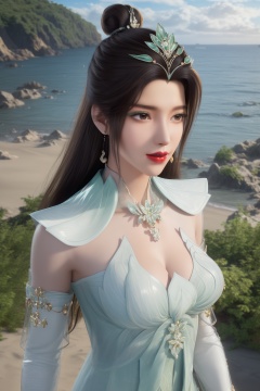 photo_\(medium\),(8k, RAW photo, best_quality),(masterpiece:1.2),(realistic:1.2),(photorealistic:1.3),(ultra-detailed),(extremely_detailed_cg_8k_wallpaper),(crystal_texture_skin:1.3),(shiny:1.2),(shiny_skin:1.4),(extremely_delicate_and_beautiful),shenfengYanRuYu,1girl,solo,detached sleeves,green dress,torogao,bouncing breasts,hair bun,standing,jewelry,hair ornament,earrings,red lips,necklace,realistic,looking at viewer,green theme,summer,beach,sea,sunshine,<lora:shenfengYanRuYu_20240525103110-000005:0.7>,