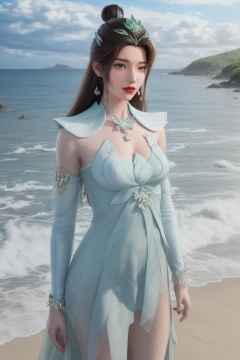 photo_\(medium\),(8k, RAW photo, best_quality),(masterpiece:1.2),(realistic:1.2),(photorealistic:1.3),(ultra-detailed),(extremely_detailed_cg_8k_wallpaper),(crystal_texture_skin:1.3),(shiny:1.2),(shiny_skin:1.4),(extremely_delicate_and_beautiful),shenfengYanRuYu,1girl,solo,detached sleeves,green dress,torogao,bouncing breasts,hair bun,standing,see-through,jewelry,hair ornament,earrings,red lips,necklace,realistic,looking at viewer,green theme,summer,beach,sea,sunshine,<lora:shenfengYanRuYu_20240525103110-000006:0.7>,