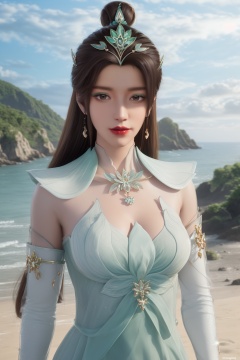 photo_\(medium\),(8k, RAW photo, best_quality),(masterpiece:1.2),(realistic:1.2),(photorealistic:1.3),(ultra-detailed),(extremely_detailed_cg_8k_wallpaper),(crystal_texture_skin:1.3),(shiny:1.2),(shiny_skin:1.4),(extremely_delicate_and_beautiful),shenfengYanRuYu,1girl,solo,detached sleeves,green dress,torogao,bouncing breasts,hair bun,standing,jewelry,hair ornament,earrings,red lips,necklace,realistic,looking at viewer,green theme,summer,beach,sea,sunshine,<lora:shenfengYanRuYu_20240525103110-000005:0.7>,