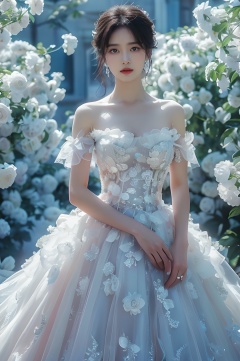 (best quality, masterpiece:1.3),1girl,dress,solo,flower,white flower,breasts,earrings,black hair,cleavage, (looking_at_viewer:1.4),(eye-contact:1.4), jewelry: spring_flower, (blue wedding dress:1.4), Tindal Light, <lora:YG花海:0.7>