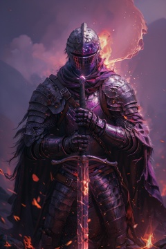 sdmai, weapon, sword, armor, helmet, holding weapon, holding, holding sword, solo, gauntlets, cape, full armor, 1other, standing, chainmail, ambiguous gender, fire, shoulder armor <lora:SDMAI骑士铠甲:0.75>