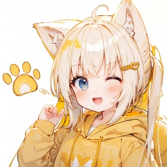 (8k, RAW photo, best quality, masterpiece:1.2),(yellow theme:1.6),loli, solo, long hair, looking at viewer, blush, smile, open mouth, bangs, blue eyes, hair ornament, long sleeves, white background, animal ears, twintails, upper body, ahoge, white hair, one eye closed, hairclip, fang, cat ears, hand up, hood, animal ear fluff, sleeves past wrists, hoodie, hood down, ;d, clothes writing, drawstring, paw print, white hoodie,