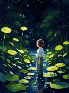 masterpiece,top quality,best quality,(heikala style:1.3),solo,1girl,wading,shirt,short hair,short sleeves,lily pad,flower,water,profile,wide shot,plant,pants,standing,fireflies,white flower,brown hair,white shirt,(watercolor pencil),