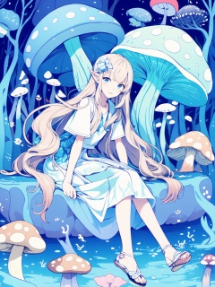 (shikimi style:1.3),flat color,(lineart),1girl,long hair,blue eyes,solo,sitting,(mushroom:1.2),white hair,flower,(blue jellyfish:1.2),looking at viewer,bangs,hair ornament,dress,forest,tree,water,hair flower,pointy ears,very long hair,sandals,full body,short sleeves,(masterpiece),(best quality),(ultra-detailed),illustration,Dynamic angle,