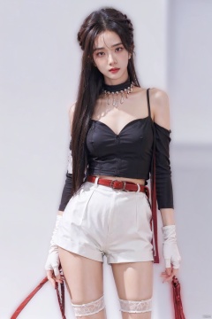 1girl, reisalin_stout, red_shorts, breasts, jewelry, brown_hair, shorts, gloves, solo, large_breasts, short_shorts, thighhighs, cleavage, necklace, braid, thigh_strap, key_necklace, hat, white_headwear, earrings, partially_fingerless_gloves, open_mouth, single_thighhigh, thighs, belt, brown_eyes, short_hair, jacket, bare_shoulders, blush, yellow_jacket, key, single_sidelock, bangs, looking_at_viewer, beret, sleeveless, black_ribbon, :o, black_thighhighs, sweat, side_braid, brown_belt, leather_belt, shirt, grey_background, leather_gloves, pouch, ribbon, black_gloves, white_shirt, brown_gloves, collarbone, thick_thighs, hand_on_hip, sleeveless_jacket, hair_ornament, maolilan,moyou, wangyushan, ((poakl))