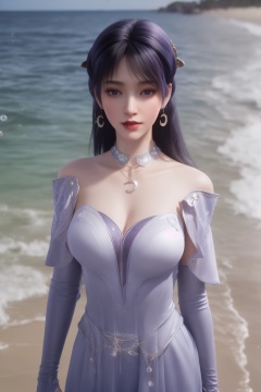 photo_\(medium\),(8k, RAW photo, best_quality),(masterpiece:1.2),(realistic:1.2),(photorealistic:1.3),(ultra-detailed),(extremely_detailed_cg_8k_wallpaper),(crystal_texture_skin:1.3),(shiny:1.2),(shiny_skin:1.4),(extremely_delicate_and_beautiful),shenfengYanRuYu,1girl,solo,dress,detached sleeves,torogao,bouncing breasts,standing,jewelry,hair ornament,earrings,red lips,necklace,realistic,looking at viewer,purple theme,summer,beach,sea,sunshine,<lora:shenfengJiZiYue_20240525170749-000003:0.7>,