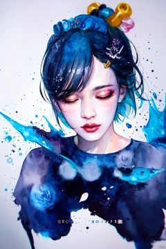 Watercolor, Watercolor painting, Color ink painting, Hand-drawn, Splash ink, Color ink, Rich in color, Pigment spraying, 1girl, solo, chromatic aberration abuse,1girl, solo, black hair, hair ornament, white background, closed eyes, upper body, lips, makeup, watermark, traditional media, painting \(medium\), abstract